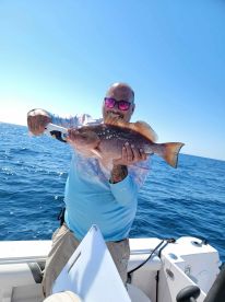 Amberjack, Skipjack, Cobia, Dolphin (Mahi Mahi), Gag Grouper, Red Grouper, Scamp Grouper, Almaco Jack, King Mackerel (Kingfish), Lane Snapper, Red Snapper, Vermilion Snapper, and more could be biting, depending on the season.