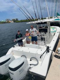 Your day begins aboard a very clean 34' Venture center console that can carry up to 6 passengers. It has outriggers, downriggers, and all the essentials no fishing machine can run without. There's a toilet on board for your convenience. Rods, reels, and tackle are provided, as well as lures. Live bait is available, but it's good to ask about this so you know if you'll be catching it yourself.
