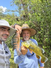Peacock Bass, Largemouth Bass, and a variety of exotic cichlids, depending on the season.