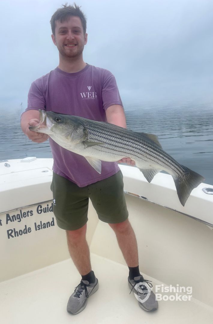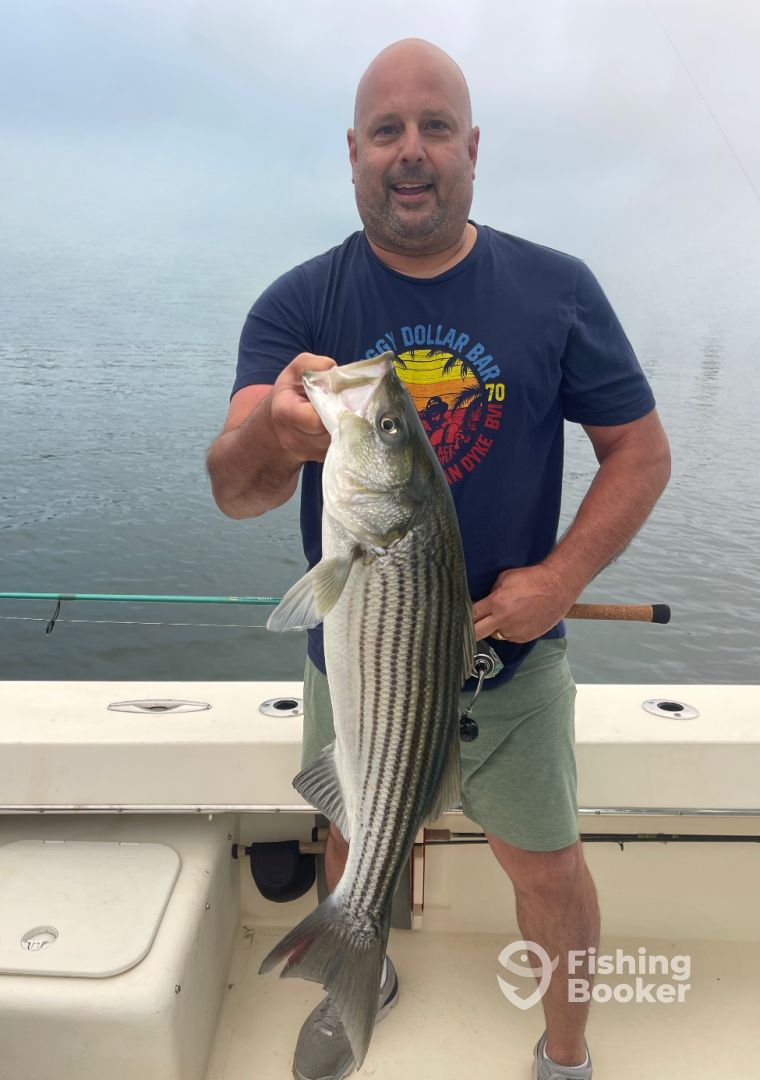 I took my nephew out to hopefully catch his first striper. Even though it was fogged in and a bit choppy Paul still got on...