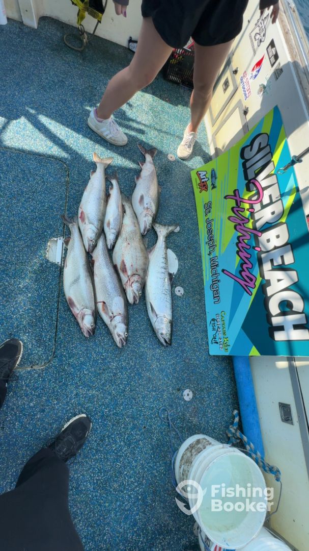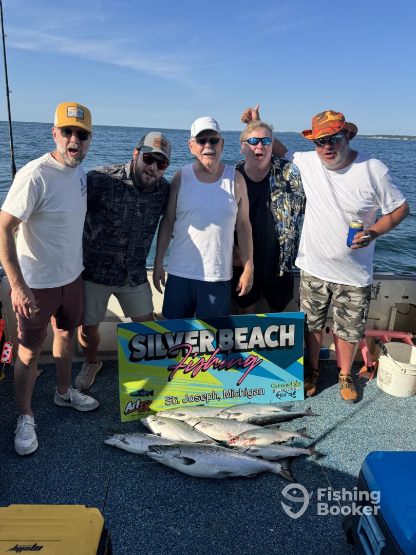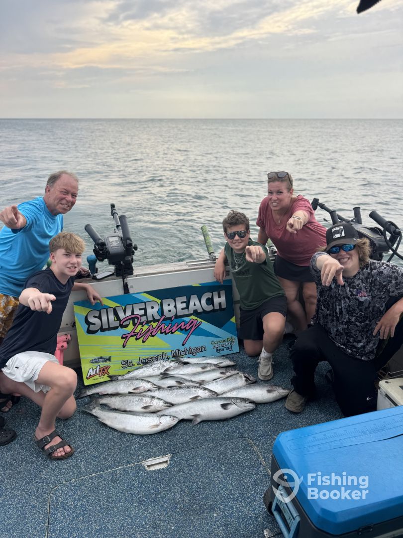 - I troll for salmon and trout using down riggers, dipsey divers and my generation has invented and perfected the technique of using copper line and attaching it to side planers....this technique allows the angler to hone in on a certain depth and put more lines in the zone where the fish are targeted. It is not uncommon for me to run 15-20 fishing poles! For perch and walleye fishing, I Fish VERY aggressive. I like to jig and drift until i find the fish. When i leave the dock, i am looking to limit you out, however , i understand that it is called fishing and will take whatever we are blessed with. At the end of the day, you will go home with some of the Midwest’s best eating fish. Whether it’s a family fishing trip, a business trip or any other special event, put your trust in a Captain that has done his job continuously for decades and LOVES having fun and killing fish. Check out our Facebook pics and vids at SILVER BEACH FISHING and contact me today 269.338.3182 As always, FISH ON!