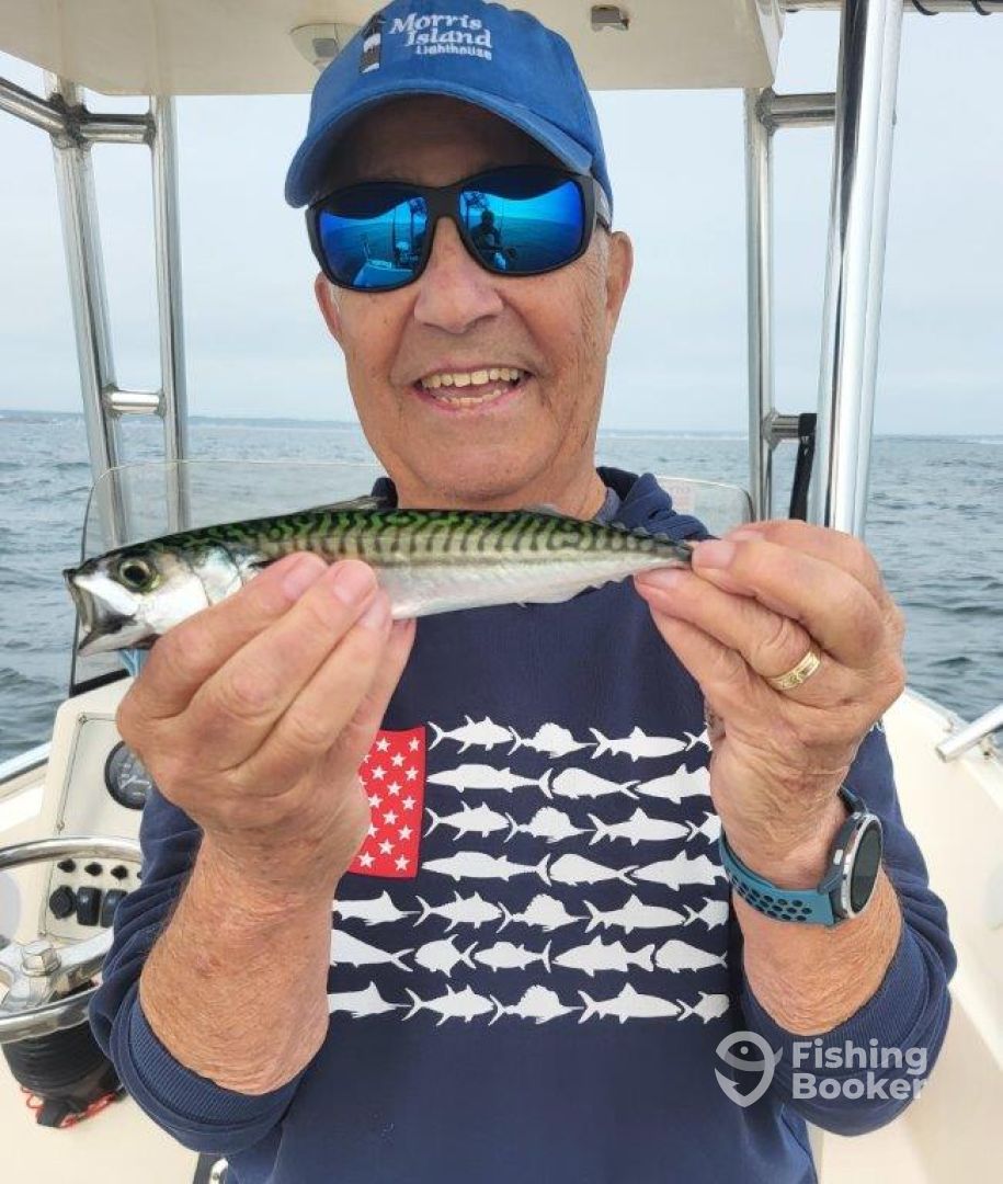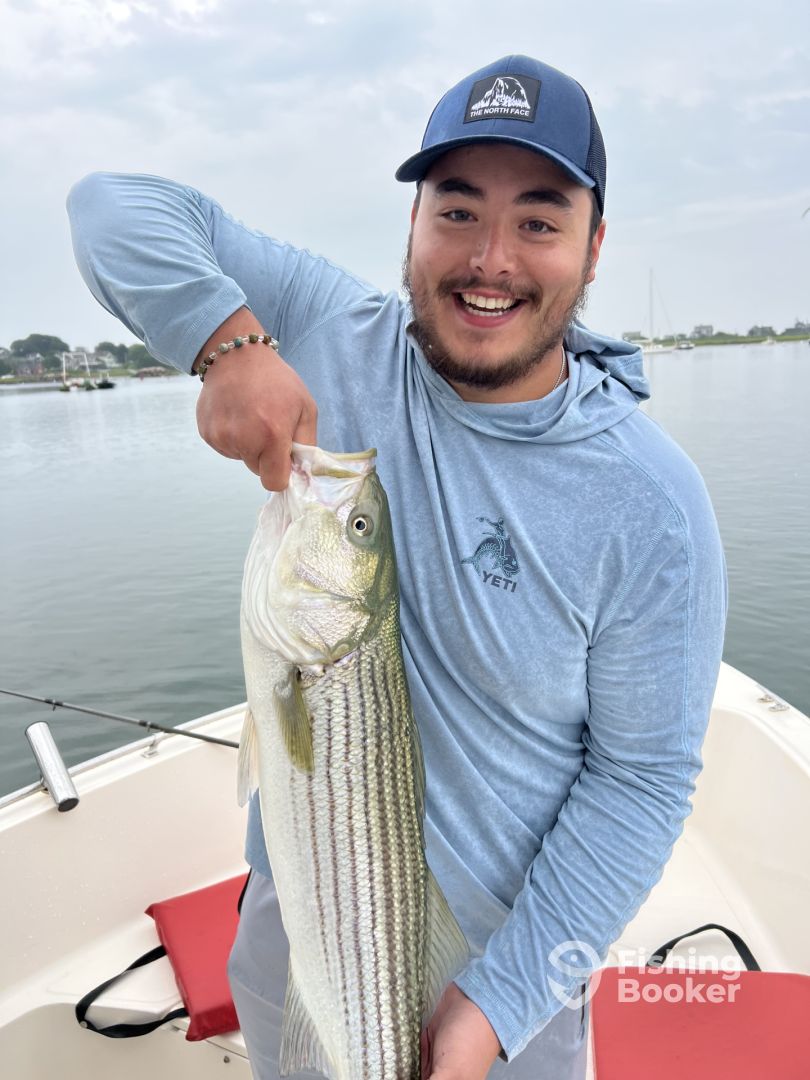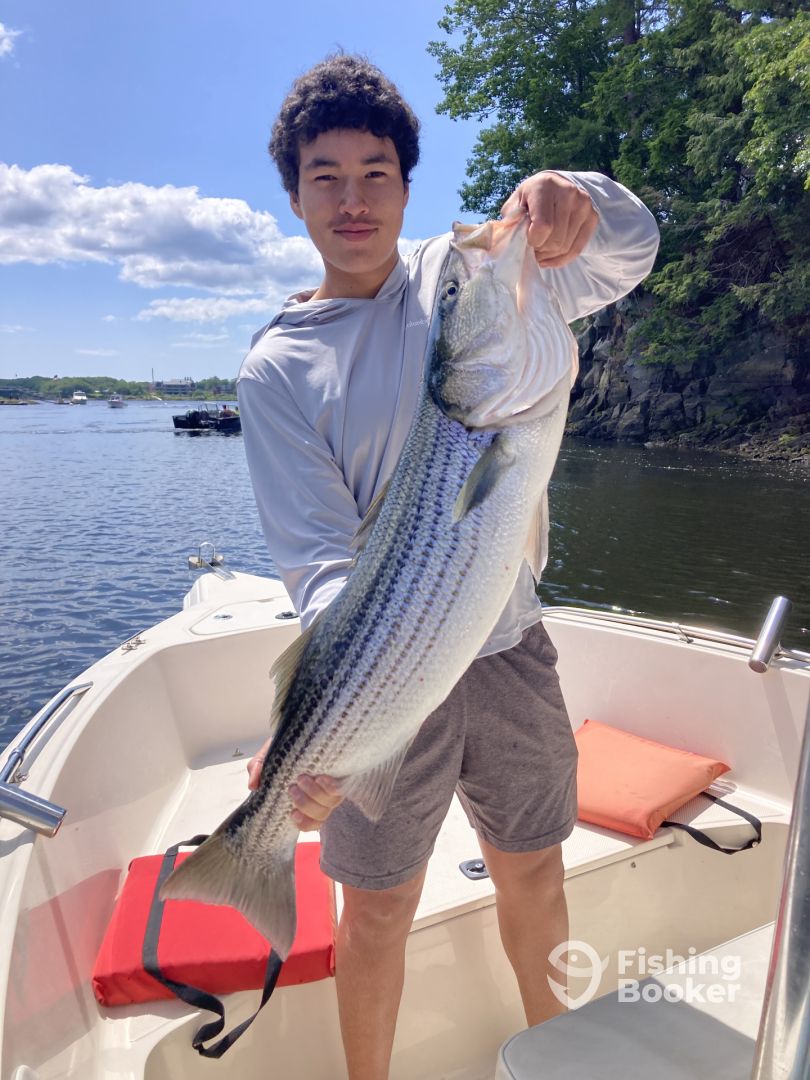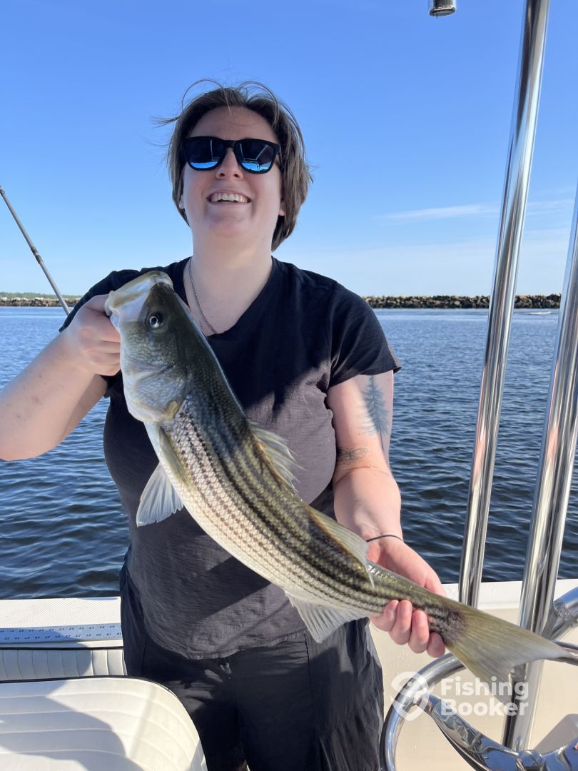 - Captains Tom and Donna troll for Striped Bass with custom tube/worm rigs.