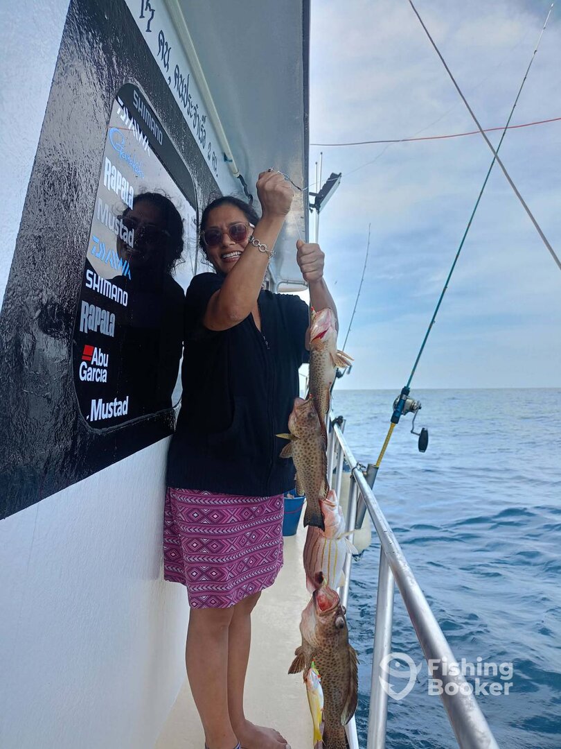 We had to move our fishing day due to a conflict and Alex made this vey easy. The captain and mate were both Thai and spoke very little English, but this didnโt matter. They were both very professional and did their job very well and we never felt unattended. I was the only experienced fisher in the group and jigged up some beautiful fish; and with help from the crew the rest in my party all caught fish, some of which were their personal best. We trolled up a skipjack tuna on the way to the jigging grounds (sashimi for later) and jigged up a bunch of very good sized groupers and snappers as well as some other exotics caught on saki and jigs. The crew cooked up some of the grouper we caught and made sashimi with the tuna for lunch which was really great.