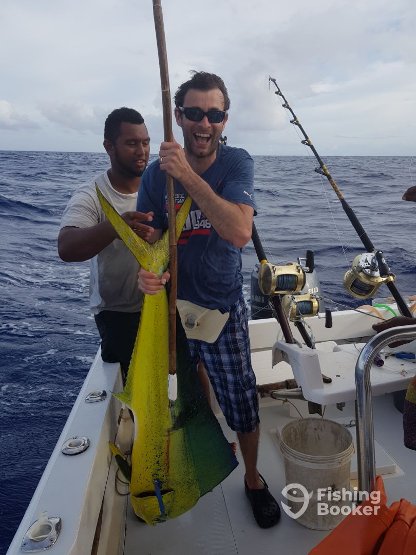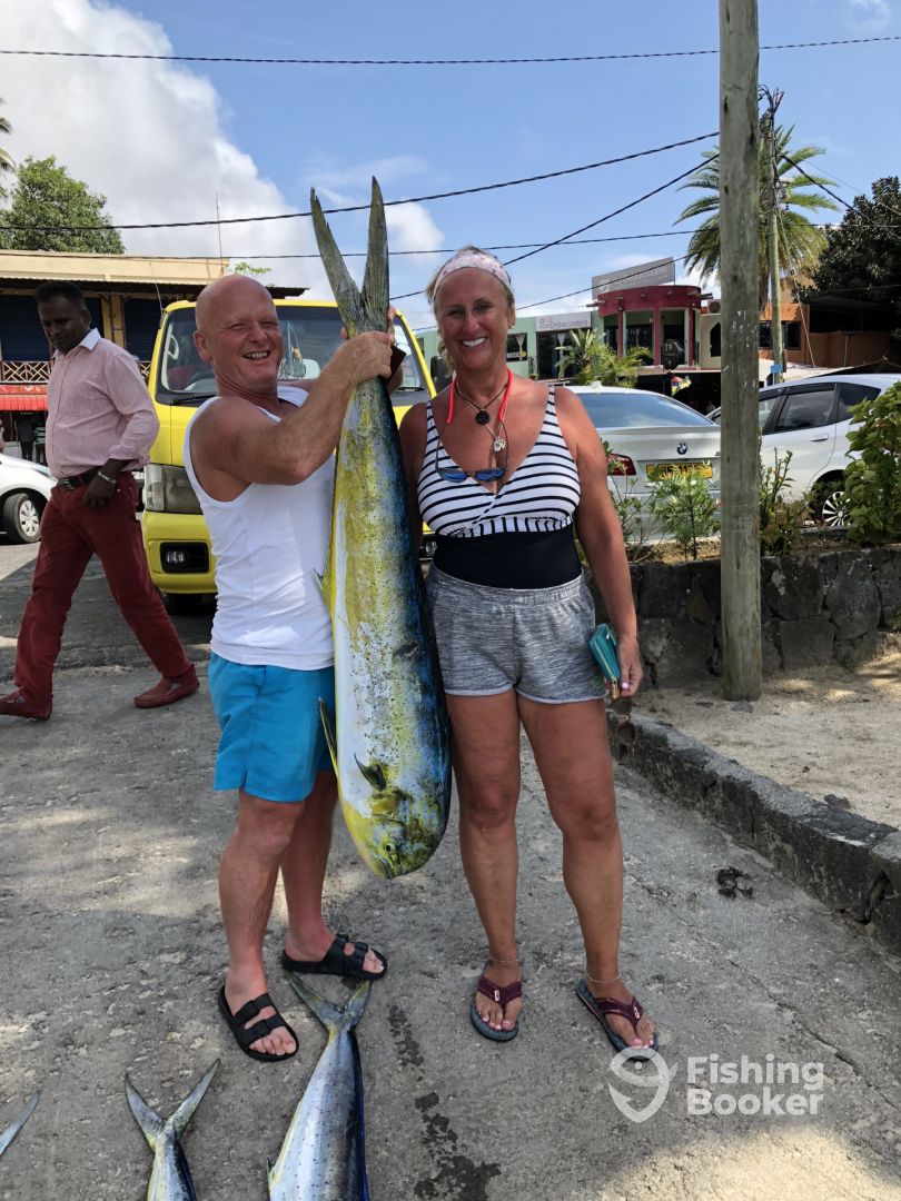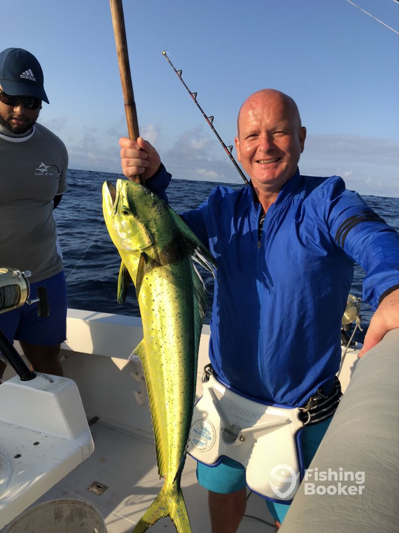 We had a fantastic trip on board Coeur de Lion on 23rd April 2018. Kevin visited us at our hotel a couple of days before the trip to organise timings and which day would be best weather wise. Luckily he was up to date with knowledge of the weather as a cyclone has just hit Even though the weather wasnt great and it was fairly rough we had a great day fishing, 6 dorado caught which my husband was very happy about. He was disappointed not to catch a yellow fin tuna as was Captain... More